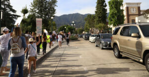 Protestors at Monrovia library park as cars drive by honking on Monday, June 6, 2020. The protest was in solidarity of the police violence George Floyd and many others were killed from.