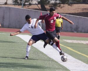 Luis Flores fights for the ball against Andreadavy Cervantes during the Lancers 4-2 loss against El Camino College at home in Robinson Stadium on Friday Oct 25, 2013. (Courier/Benjamin Simpson)