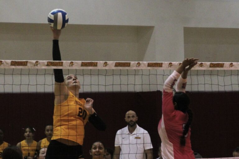 Share: Cerritos crescendoed into a challenging roar at the start of the first PCC serve Wednesday night, but they couldn’t distract the Lancers with now a 17-6 win streak under the net. Prior to the first serve, outside hitter Emma Yogan was presented with a golden ball to commemorate her milestone of 500 kills with the Lancers. Her game with the Falcons upped her score even more. Yogan scored eight kills in the first set alone and at the conclusion of the contest, had reached …