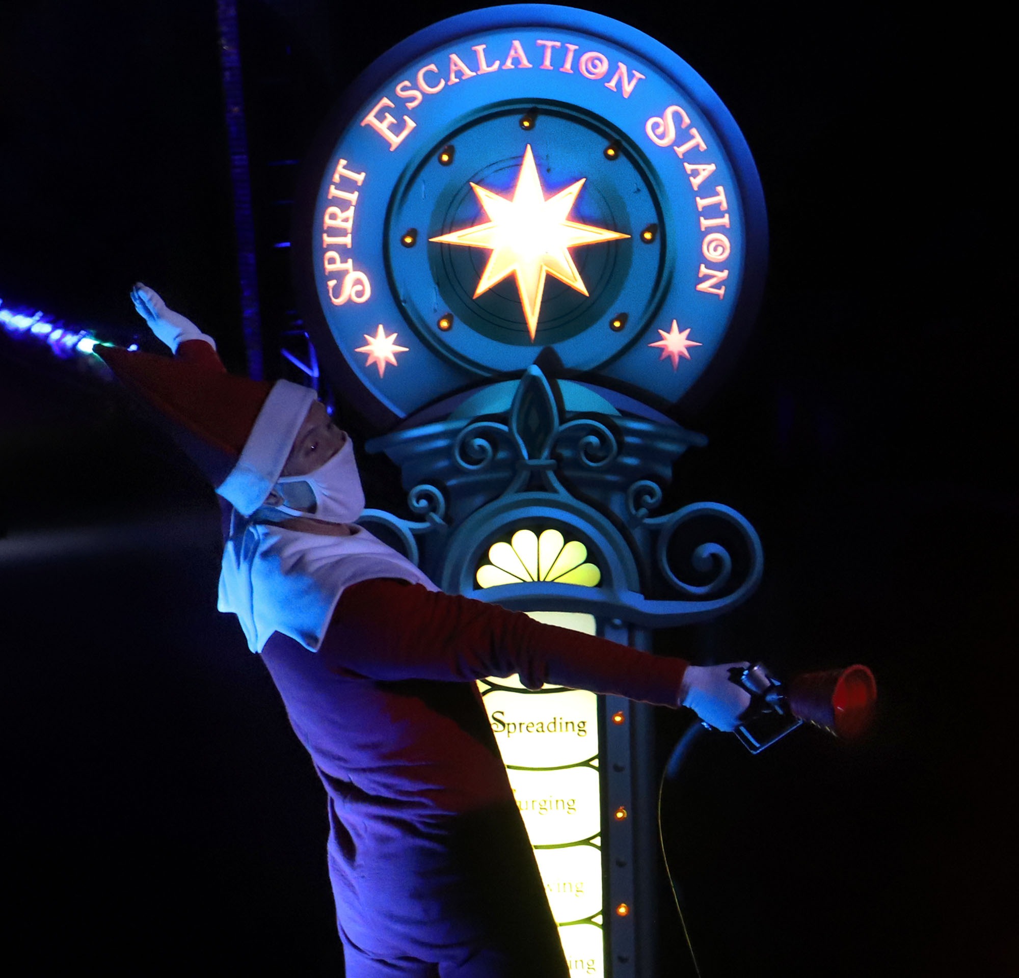 An elf measuring a cars holiday spirit at the Elf on the Shelf Magical Holiday Journey at the Pomona Fairplex on Wednesday, Nov. 11, 2020.