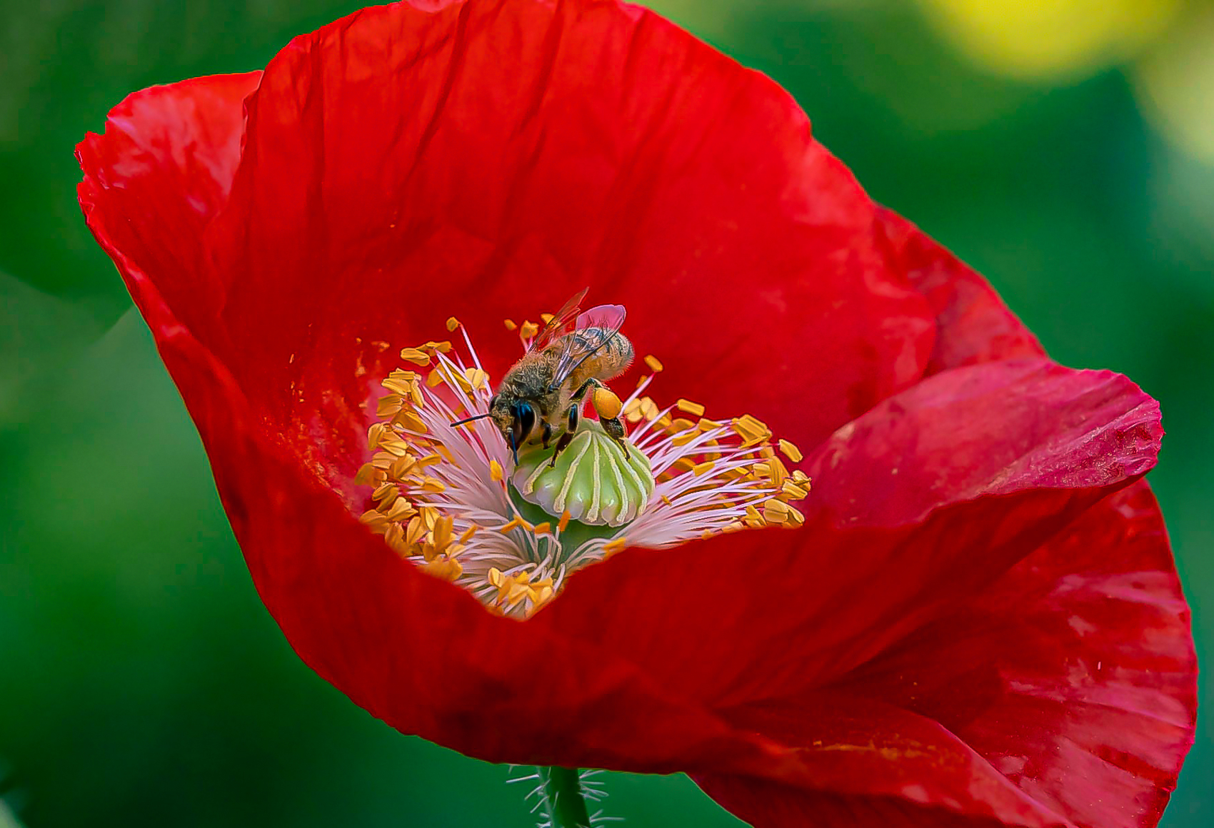 A Bee lands on a poppy at the Shakespeare Garden in the Huntington Library and Gardens , Located in San Marino, California.