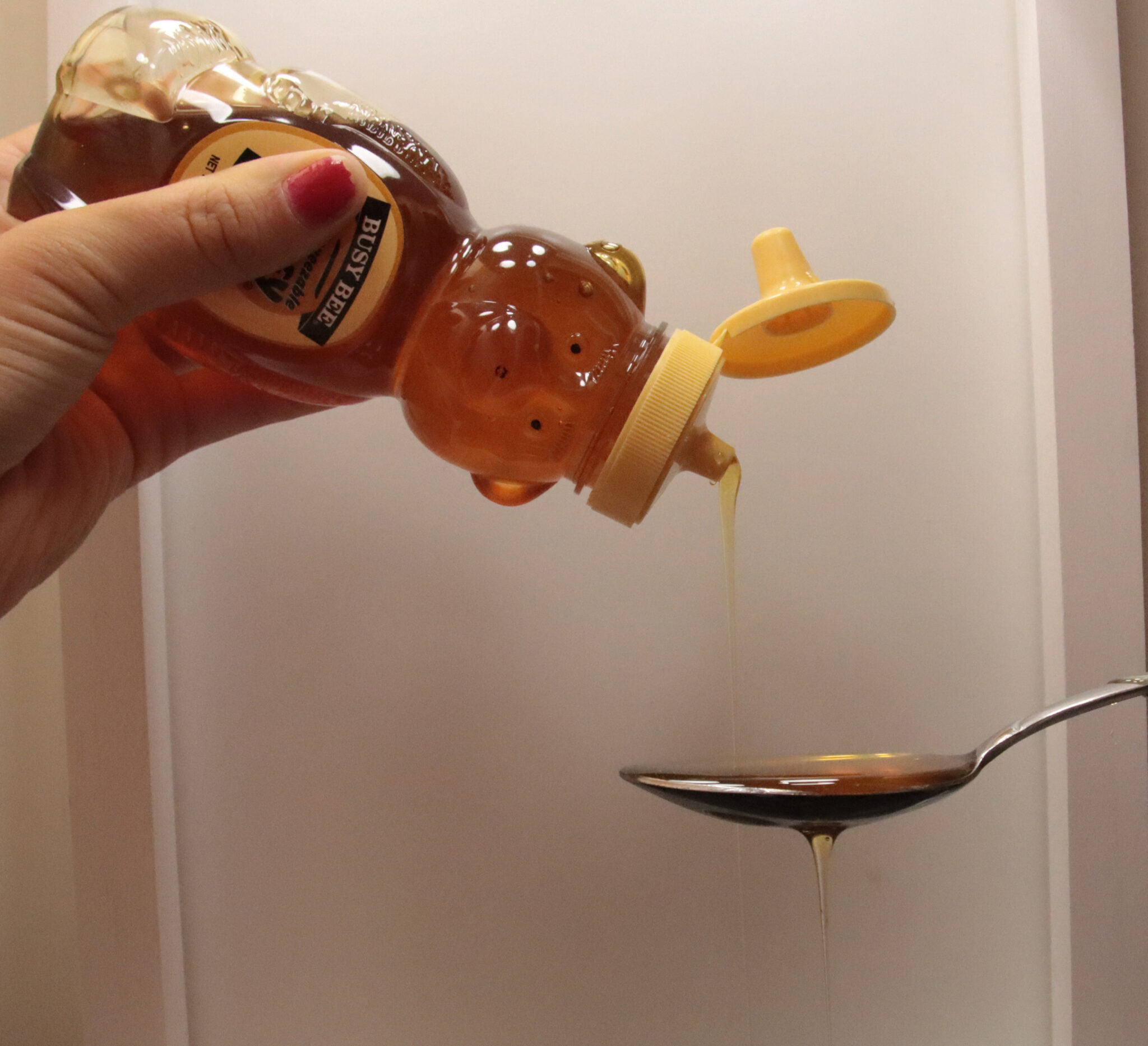 12oz bottle of Busy Bee honey lays next to a spoonful of honey on October 25, 2022 in Arcadia California.