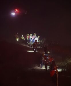A LACFD strike team creates a fire break while a water drop helicopter hovers overhead on a hillside during the Castlewood fire in Fullerton Calif. on Wednesday, October 30, 2019.